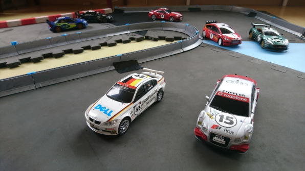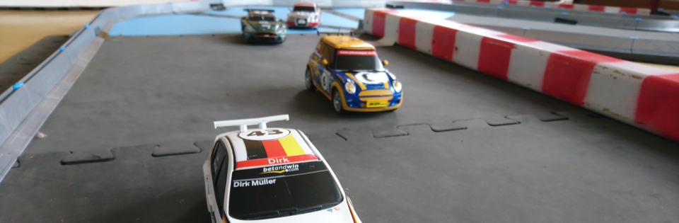 Ab Nachmittag baut unser Team die Strecke auf, nach Ihren Vorgaben steht eine Fläche von 6x8 Metern zur Verfügung. Um wetterfest zu sein, wird die Strecke im Foyer des Veranstaltungsortes aufgebaut. Für diese Fläche wird eine Strecke im Maßstab 1:28 aufgebaut, die bis zu 10 Teilnehmern gleichzeitig am Rennen erlaubt.
